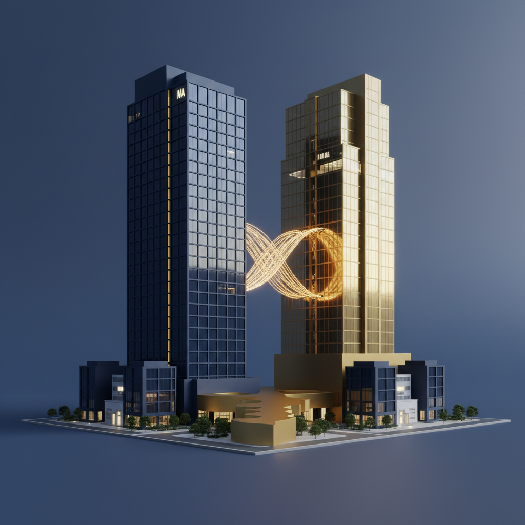 [사진: 서울 광화문 교보생명 본사 건물과 SBI저축은행 로고가 교차하는 듯한 웅장한 합성 이미지 - 두 기업의 합병을 상징하는 역동적이고 신뢰감 있는 구도]